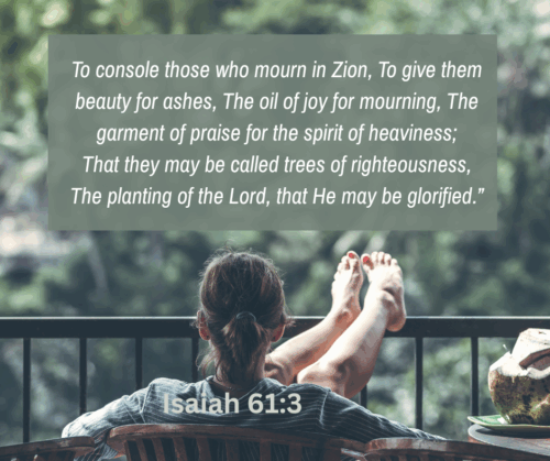 Isaiah 61:3 To console those who mourn in Zion, To give them beauty for ashes, The oil of joy for mourning, The garment of praise for the spirit of heaviness; That they may be called trees of righteousness, The planting of the Lord, that He may be glorified.”